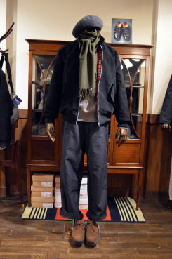 ハリントンジャケット ¥42,900 (MolleSports) ハンドフレームサドルB.B ¥22,000 (comm.arch.) MOLESKIN TROUSERS WIDE FIT ¥28,600 (Sanca) Hi Top Chukka Boot ¥52,800 (サンダース) ウールカシミヤベレー ¥20,900 (HAT MAKER KIJIMA TAKAYUKI) カシミヤマフラー ¥35,200 (ジョシュアエリス) |