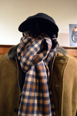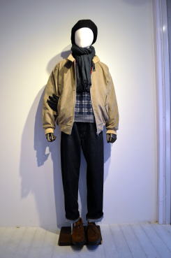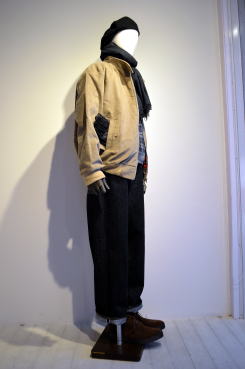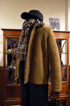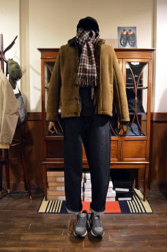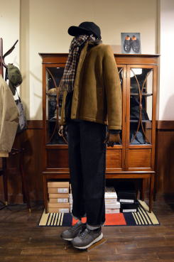 | モールスポーツの英国製ハリントンジャケットを使ったコーディネート。ブリスベンモスのモールスキンはとても風合いが良く暖かそうです。くすんだベージュのような色合いもとても良い雰囲気です。インナーはインディビのサックスカラーのオックスのB.Dシャツにジャミーソンズのニットベスト。首元には肌触りの良いカメルッチのウールストール、ウールメルトンのキャスケットはキジマタカユキ、ディアスキンのグローブはアメリカ製サリバングローブ。足元はサンダースのハイトップチャッカ。ボトムスはリラックスしたサンカの日本製ワイドデニム。 インポートとドメスティックが融合したefgらしい着こなしに。 |