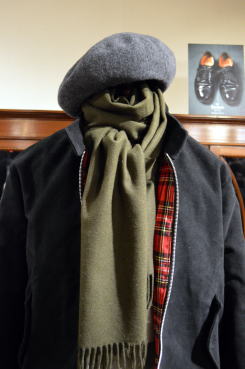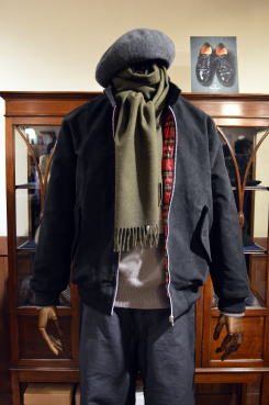 | モールスポーツのハリントンジャケットを使ったコーディネート。 インナーはコムアーチのセーター、ボトムスはサンカのワイドトラウザー、カシミヤのマフラーはジョシュアエリス、キジマタカユキのウールカシミヤベレーに、靴はサンダースのハイトップチャッカ。 厚手のモールスポーツのハリントンジャケットはこれから冬に向けてオススメのアウター。ちらっと覗く鮮やかな赤のタータンチェックがシックな色使いのコーディネートのアクセントに。オーセンティックなハリントンジャケットをサイズバランスや着こなしで、固過ぎない、少しリラックス感のある大人のハリントンジャケットスタイルを意識しました。 |