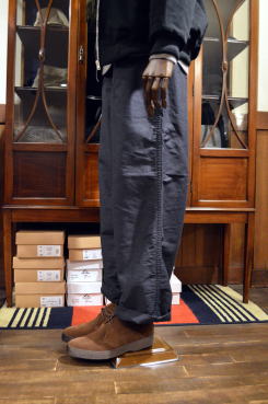 | リネンの王様と形容されるアイルランドのSpence Brysonのアイリッシュリネンを使用し、フランス最古のワークウェアブランド、ル・トラヴァイユール・ガリスが製作したフランス製リネンブルゾンとワイドなワークパンツの上下で。 efg的にはセットアップ提案はほぼしませんが、元々ワークウェアを作っているガリスだけあって、アイリッシュリネンを使ったユニホームのような着こなしをイメージしました。 インナーにはインディゴデニムにネイティブな刺しゅう使いのちょっとクセのあるメキシカンシャツを合わせました。ネイビーにインディゴの敢えて近い色合わせの着こなしに白い刺しゅう使いが洒落たアクセントに。 足元にヒョウ柄のフランス製別注サンダルを合わせたところもefg的着こなし提案の一つです。 |