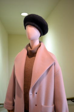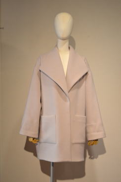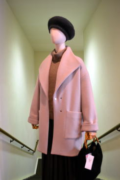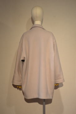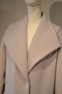「豪ヴィクトリア州産のラムウールの中でも、一番綺麗で高価な背中部分から採れる希少部位ウールを100%と使用しております。雑味がなく、均一性があり、上品な光沢のあるこの部分のウールに、丁寧に起毛加工を施し、膨らみと暖かさを施しました。結果、とても軽く滑らかで保温性が高いコート用生地が仕上がりました。今回は、毛布にくるまったようなシンプルな形のコートを製作しました。極力縫製ステッチを表に出さないようにしたので、見た目もスッキリ、大人な印象です。袖口は折り返すことができる仕様にしております。」