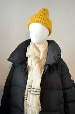 インナーはコムアーチの肌触りが気持ち良いメリノウールのカットソーにコムアーチのハンドフレームスーパーメリノノースリーブベストを重ねました。ゆったりとしたブラウンのパンツもコムアーチ。白いレザースニーカーはスプリングコート。ブラウン系のスタイリングによく似合うきれいなオレンジのワッチキャップはキジマタカユキ。贅沢なカシミヤ100%のワッチキャップはストレスとは無縁の最高の被り心地です。