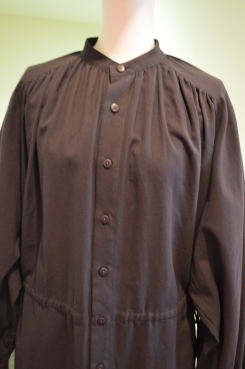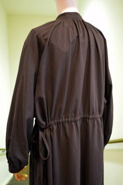 「インド綿にカシミヤを5%混紡することで、ほんのりしっとりとした触感が加わったシャツ用ビエラ生地を使用し、襟元、背中、袖口、ウエストにたっぷりとギャザーを寄せたシャツドレスを製作しました。ウエストに共布スピンドルを通すことで、シルエットを大胆に変えられるのもこのシャツドレスの特徴です。通年着用できるとても雰囲気のあるアイテムに仕上がりました。」