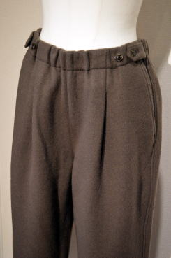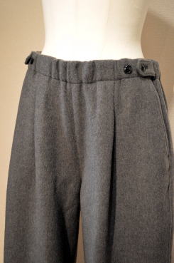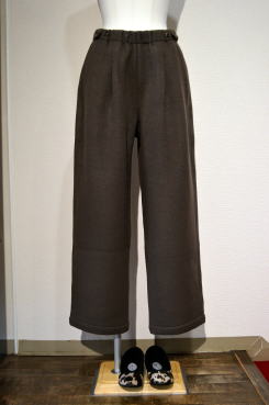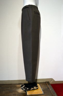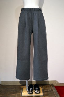 「ニュージーランド産ウールでしっかりと織り上げ、ウエストにアジャスター仕様のワイドパンツを製作しました。ダブルフェイスとまではいきませんが、それでもしっかりとした厚みがあるためインパクトも保温性も兼ね備えた、真冬に重宝するウールワイドイージーパンツです。裾も少しテーパードさせたいるので、シルエットのアクセントも出ます。」