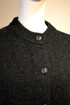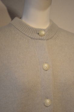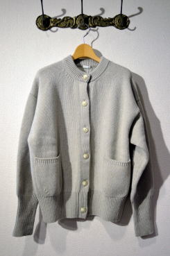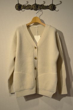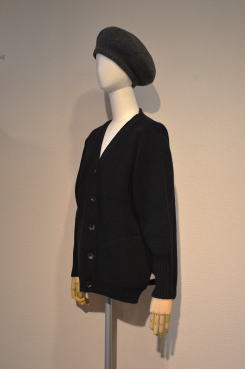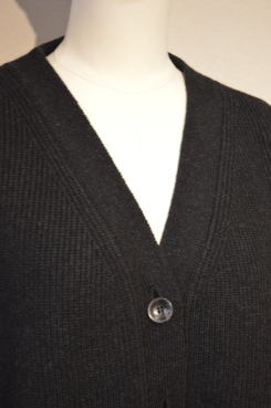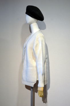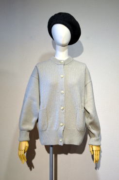 その素材を使用し、ごくシンプルな14ゲージ天竺でカーディガンを製作しました。カーディガンは羽織りアイテムとして長く着用頂けるように全てがオーソドックスですが、見頃と前立てを一重で編み上げるなど、見た目の軽さ、簡素さを重視しました。春先から夏の冷房対策まで長くご着用できるアイテムです。」