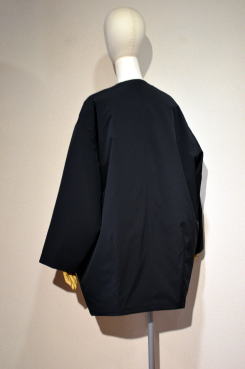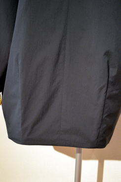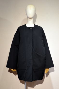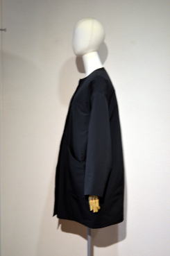 「素材は国内で機能素材の開発しているメーカーの特許技術を取得しているダウンジャケット用生地を使用。暑い時は衣類内の湿気を素早く取り除き、寒い時は暖かさをキープし衣類内の温度を常に快適な環境にコントロールできる驚きの新テクノロジー素材です。表面にシワ加工を施しており、シンプルながらも雰囲気のある中綿のノーカラーコートに仕上がりました。大きなパッチポケットと後裾のダーツが特徴です。袖口を折り返すことができる仕様にしております。」