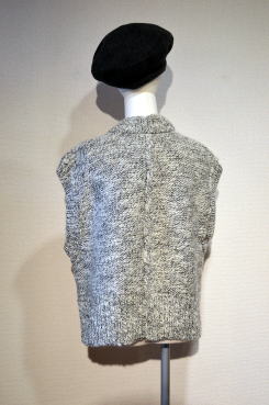 「素材は南米産の弾力感のあるウルグアイウールを使用しています。手編みにも使用されるくらいの太い番手なため、手横編み機でも衣類を製作するのに一番ローゲージの1.5ゲージで製作しております。ベストは敢えて表遣いと裏遣い合わせることで少し違和感を表現、ハンドリンキング部分を表に出すことでまるで刺?のチェーンステッチのように見せるなど、1.5ゲージでしか出せないクラフト感が特徴です。フワッとしたモックネックが可愛らしいベストに仕上げました。」