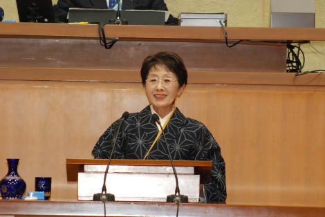 今日は、いつも浜絣を着るのですが、ウールの普段着の着物を着てまいりました。これは、祖母がくれたものであります。私の祖母は浜絣のプロの織り子でございましたが、自分は絣が嫌いだと言って私にくれたのがこのウールの着物でございました。機織りは、大変苛酷な労働でありましたが、農家の現金収入として大変貴重なものでございました。私の叔父は、そのお陰で大学を出してもらい裁判官になって、そして勲二等までもらったのでございますが、姉である私の母は女学校にすら出してもらえませんでした。