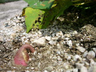 地上に出ている葉っぱの部分があまりにも茂りが少ないため今年の実りは期待薄かなと思っていた頃、発見した芋の頭に大喜び!!