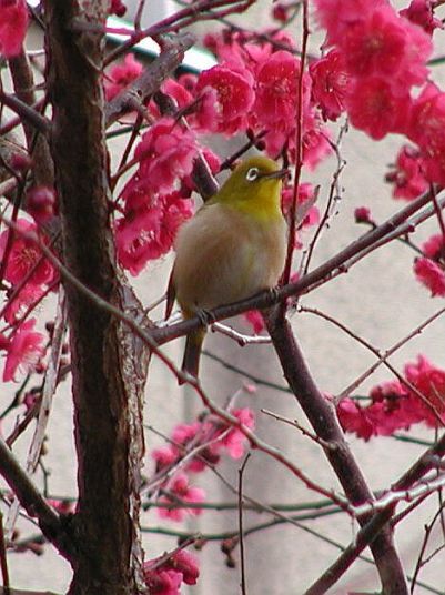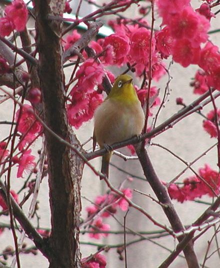裏庭の紅梅の花の中で、めじろが一羽気持ちよさそうに