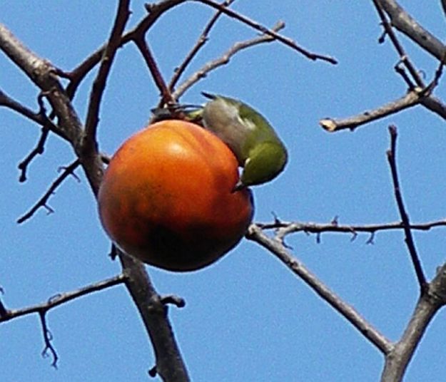 庭の花御所柿を高枝鋏で採っていたとき、メジロの群がやってきた。脚立に乗って高枝鋏を高く