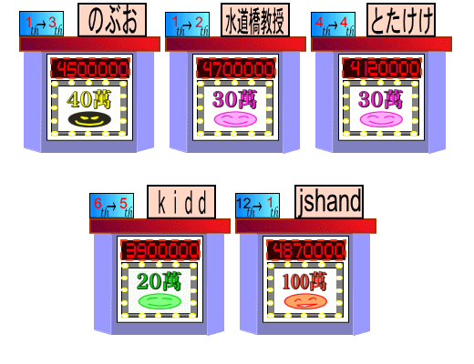 さらに金塊大放出!参加された全ての皆さんにも金塊をあげちゃうぞ!獲得マネーの1/20(小数点以下切り上げ)の金塊をプレゼント!勿論10位以内の方にも先に渡した金塊に上乗せです。なのでTOPのjashandさんは合計325gです。なお、0萬で終わってしまった方にもわずか1gですが記念に差し上げます。