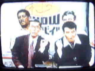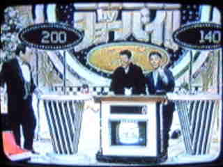 | ▲(S63.12.14 O.A.)1人正解!しかも50萬獲得でイスに乗って大喜びする山城さんです。このあと逸見さんが「ラストクイズの前に100萬獲得してしまうかもしれない・・・」と言っていましたが・・・・右に続く。 | ▲次のクイズのミリオンスロットの前にナベさんが「ここで5萬が出れば面白いですねー。」 逸見さん「5萬出ろ!」と言ったところ、本当に5萬が出てしまい、大喜びする司会陣と愕然としている山城さんです。「5萬出ろ」と言えば思い出されるのが高田さんですが実は逸見さんが元祖なんですね。ただどっちとも被害者は山城さんでした。 | ▲初の特番、クイズ正月は〜です。2人ともビシッと決めておられます。結果は390−310で逸見チームの勝ちでした。(S64.1.4 O.A.) |