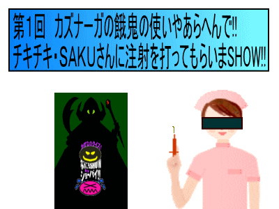「実はSAKUさんはまだ生き残っておられるが、残念ながら事情により、次の問題に参加できないそうだ。そこで罰ゲームの執行人として参加して頂こう。今回の罰ゲームはなんとSAKUさんに予防接種を打ってもらえるというものだぞ!あの目伏せは何かって?あれは目隠しだ!ただ単に注射をするのでは面白くない!そこでSAKUさんには目隠しをして注射をやってもらいましょう! さあ、このこわーい罰注射をされたくないという人は頑張ってくれたまえ!」