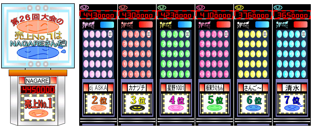 | ●売上指数とは個人の得点を平均点で割ったものを100倍したものです。 ●プライズとは売上No.1の方に「ゴールドバー」を、BEST14の方に「ゴールドコイン」を、売上指数が200を越えた方には「ゴールドプレート」を1枚、以下300で2枚、400で3枚・・・・さしあげます。(もちろんバーチャルです。)また、クイズ別に特に優秀な成績を残された方にゴールドカードをさしあげます。 |
