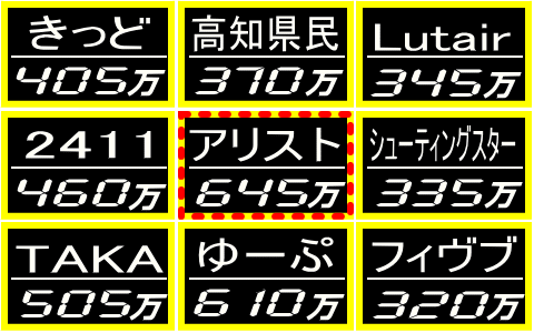 ![]() かずな「ということで9回目となりますスーパークイズスペシャル、優勝はアリストさんに決定しました!終始1位を走られての見事な勝利でした!おめでとうございます!アリストさん、今のお気持ちは?」 アリスト「やったぞ! 初優勝することができました。かずなさんのクイズ初めて参加は2015年1月の第4回ウルトラクイズです。今までの参加回数は20回前後、今年で10年目を迎えました。過去の最高成績は第52回大会4位。他は去年のインスピ漢字ダービー5位、第7回スーパークイズSP7位がベスト10圏内なら以上です。だいたい、上位争いも下位争いもなく中間の順位でフィニッシュすることが多いです。スーパークイズSPがもし開催されたら次回はディフェンディングチャンピオンとして連覇を目指して頑張ります。その前に0〜20萬でフィニッシュするが多い苦手なエクストラのクイズ大会でも好成績を残したいです。長文になりましたが、かずなさん&参加者の皆様お疲れ様でした。」 かずな「ありがとうございました!完全勝利と言ってもおかしくない戦いでしたね。アリストさんにはSP金塊150gをさしあげます!続いて第2位はゆーぷさんです。いやあ、最後35萬差までトップに接近しました。スロット次第では大逆転も可能でしたね。SP金塊120gさしあげます。」 かずな「第3位はTAKAさん、第4位は2411さん、第5位はきっどさんでした。この3名は前回大会もトップ9に入っている実力者。さすがです!それぞれ100、80、70gのSP金塊をさしあげます。」 かずな「以下、15位までに入られた方にはSP金塊を順位に応じてさしあげます。また、16位以下でもラストクイズに答えていただいた方には1gを、また得点金塊は50萬ごとに1gをさしあげます。」 かずな「ということで9回目となりますスーパークイズスペシャル、無事終了しました。最後の2問あたりが年末進行の仕事と重なって更新が遅れたのを除けば、おおむねうまくいったのではないかと思っています。」 かずな「放送企画のように回答を全て受け取ってから集計していくのではなく、1問ごとに状況が変わる中、集計していくのは、これはこれで面白いですね。軍システムやスロットが勝負に大きく影響するのも集計していて楽しいですし。」 かずな「ということで次回は記念すべき10回目となるのですが、どうなることでしょうか・・・。それでは来年になるかどうか分かりませんが、次回、10回記念大会でお会いしましょう!参加していただいたパネラーの皆さん、ありがとうございました!」 戻る |