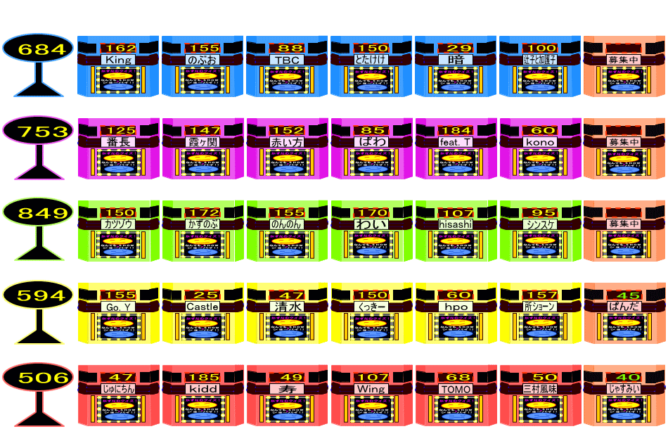 | かずな「1位はカツゾウチームで849萬!2位は753萬で番長チーム、3位は684萬でKingチーム、4位は594萬でGo.Yチーム、5位は506萬でじゅにちんチームです。次はいよいよラストクイズです!!」 |