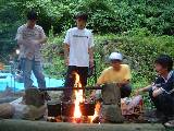 | そういえば、空はどうなっているのでしょう。 「晴れ男」VS「雨男」は?実は、諏訪酒造に着いたあたりから、ちょっと怪しくなってきていて、諏訪酒造ではパラパラと。 そして、石谷家にいるときに、とうとうにわか雨がきてしまいました。 が、見学を終えたときにはとりあえずあがっていました。 これは、私達(特に我が班班長…?)の運の良さから来るのでしょうか? …というところで一同は智頭宿を後にし、いよいよ河原町は三滝渓林間キャンプ場へと向かいました。 ここまで来てやっとキャンプの報告です(笑)。 自称・アウトドアの達人曰く「キャンプたるもの、昼過ぎに設営したらしばらくはまったりとするもの。」らしいですが、「あおぞら部会的キャンプ」は、立ち止まることを知りません …といいますか、キャンプをろくすっぽ知らない奴等の集る班員が、なまじイキオイで「キャンプしよう!!」などと言ったものだから、さあ大変!!我等アテにならない班員を尻目に、皆でテキパキと設営が進みました。 道すがら調達した東伯町の東伯牛も、お飲み物も、準備万端。 ここまできたら、あとはいつもの「あおぞら部会」のノリです。 かくして、長くて短い三滝渓の夜は深まってきました。 このひとときがまた楽しい …さて、その楽しさいかほどだったのか? それは「こちら」の方、ご覧あれ。![]() ![]() ちなみにこの三滝渓、滝と紅葉の名所とのことで、紅葉はともかく、滝は「きっと」とても素晴らしい景勝地です。 この「きっと」というトコロが、ミソなのですが(笑)。 ![]() 翌8月11日。 眠たい目を擦りながら起床、昨日の深夜降っていた雨(とうとう来てしまいました。さすが、雨男(笑)。)も上がって気持ちのいい朝でした(ここでようやく晴れ男復活。彼は(も)、はじけすぎて死んでました(笑)。)。 水車の前で集合写真をパシャッと撮り(みんなの顔すでにぐったり気味。昨日撮っとけば良かったかなーと思いながら)、いよいよ出発です。 |